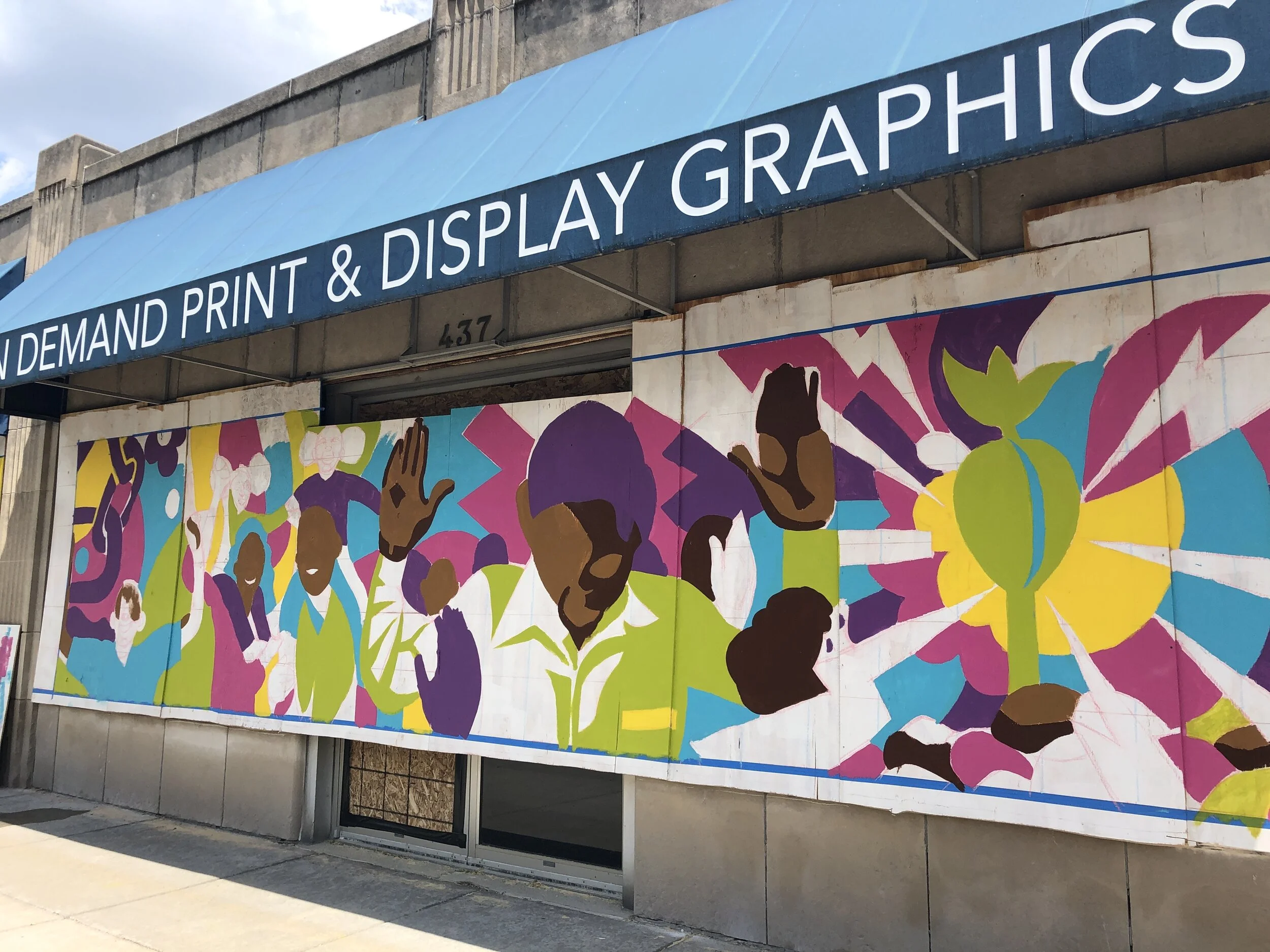 In response to protests after the unjust death of George Floyd, the Arts Council of Indianapolis commissioned several Indianapolis-based black artists to create 22 murals on boarded up storefronts in Downtown Indianapolis. My dear friend, Andre Parnell was one of the chosen artists. His mural located at ReproGraphix was painted of his vision by several volunteers. The mural will be relocated to the Cultural Trail in 2021.